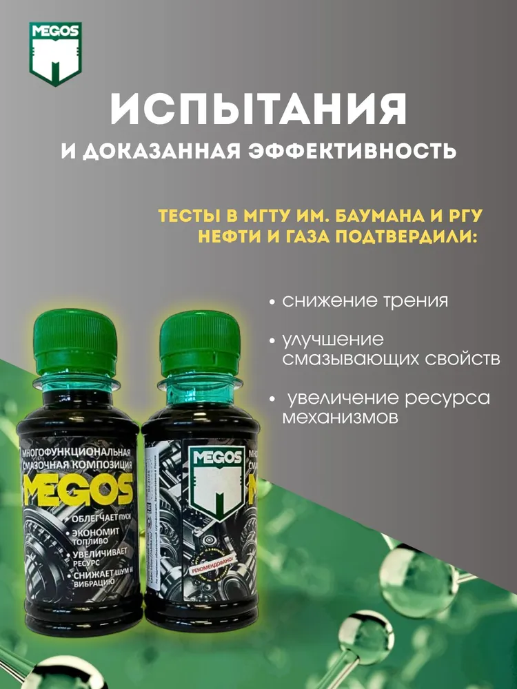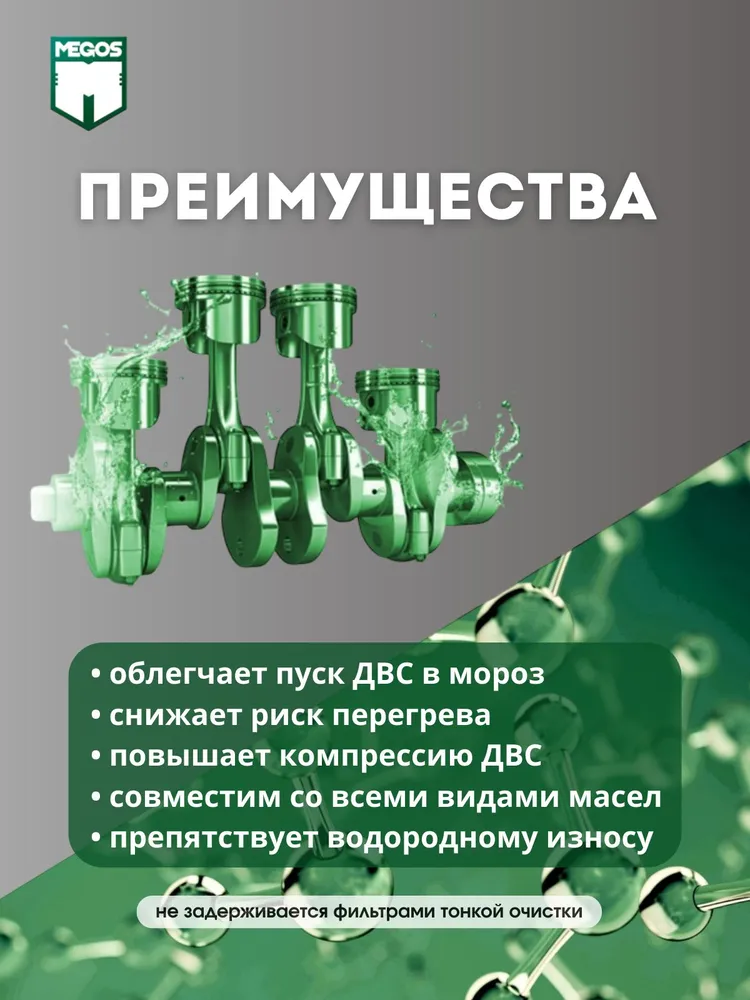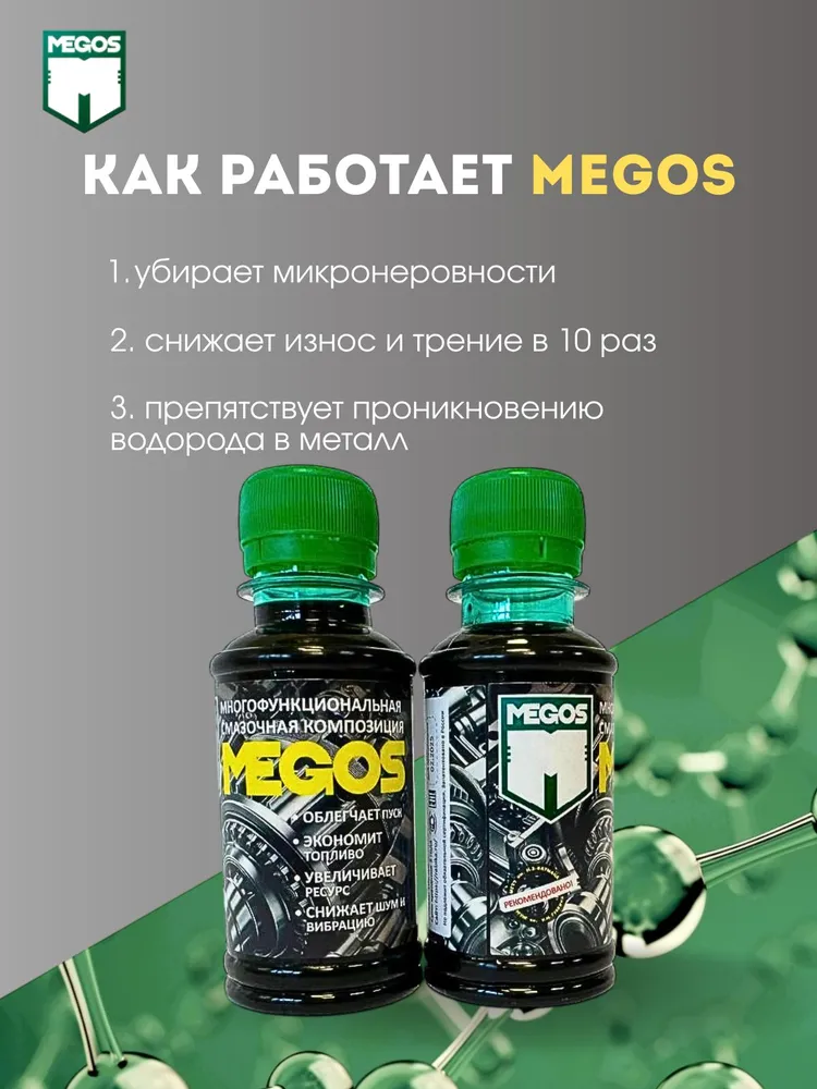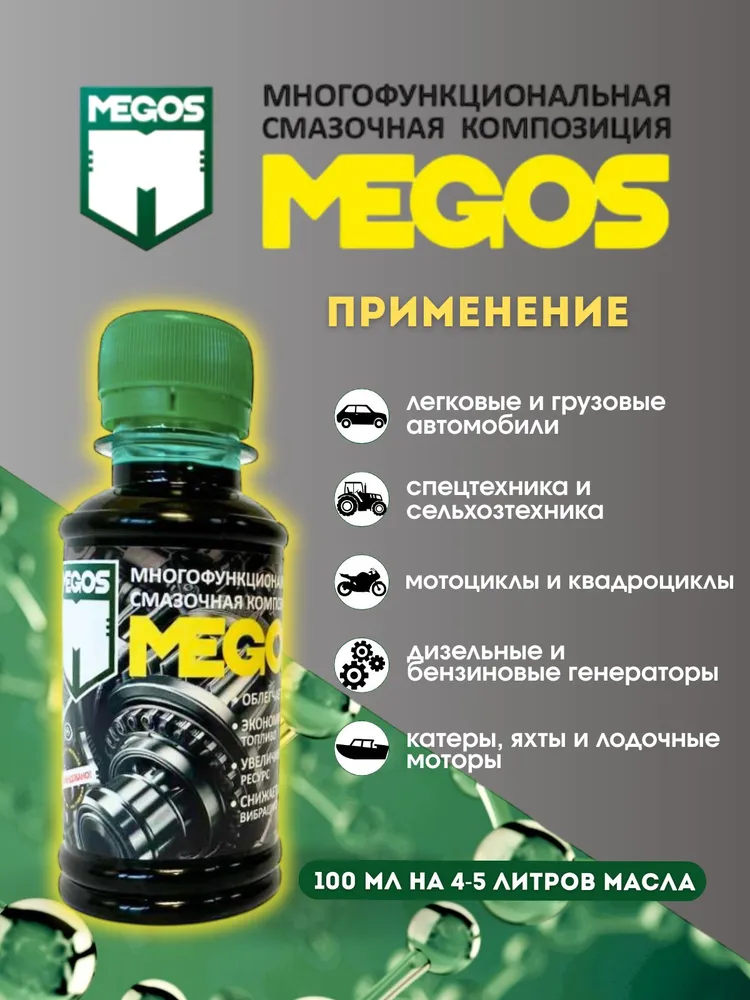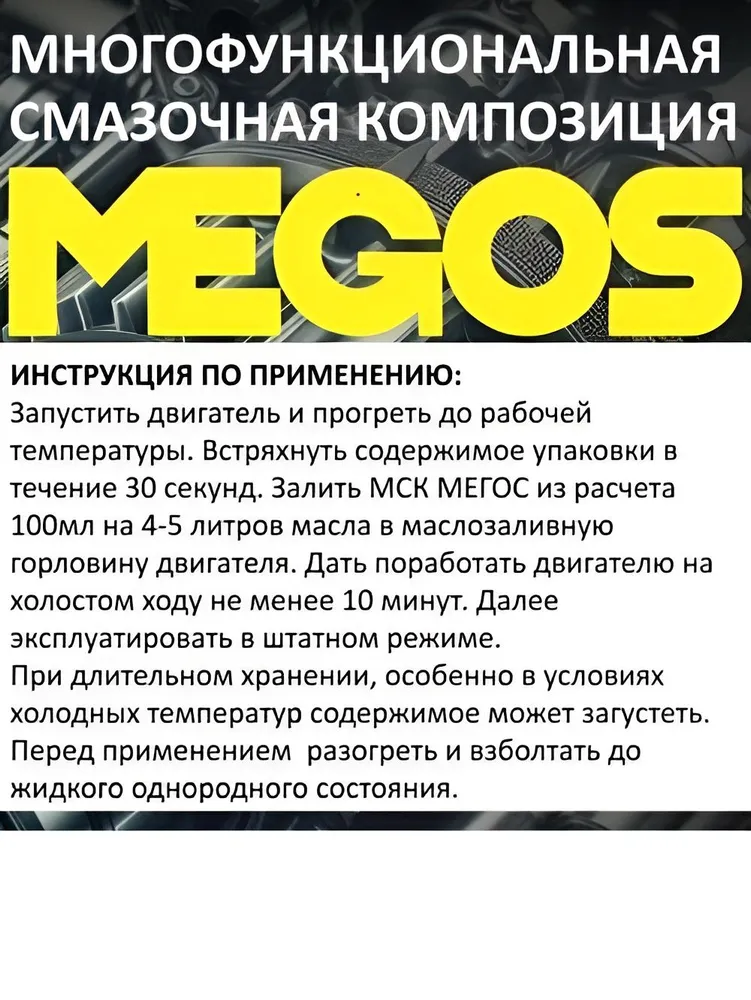 При длительном хранении, особенно в условиях холодных температур содержимое может загустеть. Перед применением разогреть и взболтать до жидкого однородного состояния. Для улучшения работы двигателя рекомендуется применять МЕГОС при каждой замене масла.