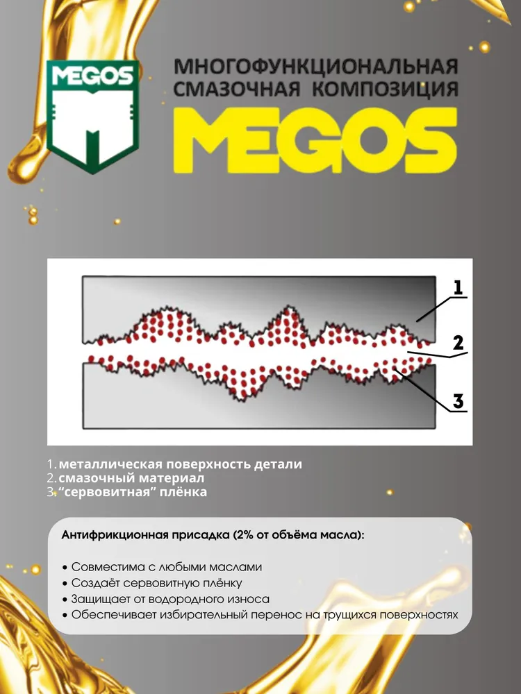 МЕГОС значительно снижает температуру в месте взаимодействия трущихся деталей, что препятствует диффузии водорода в металл. Медная плёнка нивелирует микронеровности трущихся поверхностей, увеличивая площадь контакта в тысячи раз, в результате чего снижаются скорость изнашивания и коэффициент трения примерно в 10 раз.